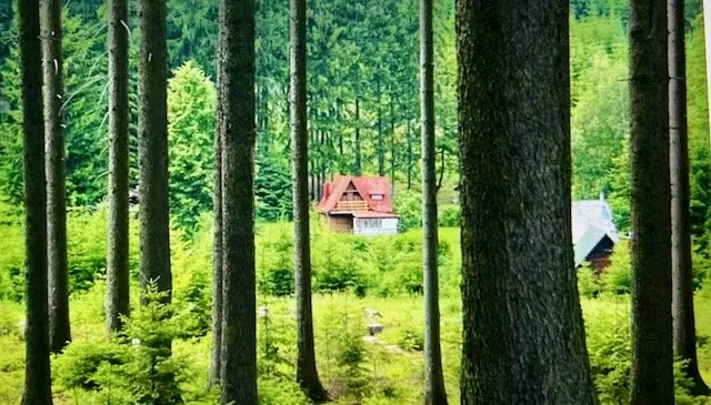 It is surrounded by land with trees and birds, critters in the grasses, gardens, a huge wide sky above, a brook and a lake — far more abundant nature than you can imagine from inside the small house.